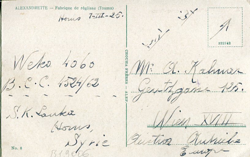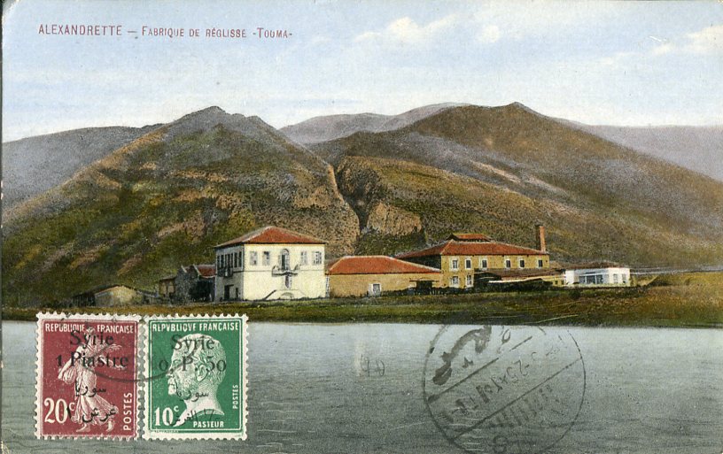 Syria: 1925 (1 March). Postcard titled ‘Alexandrette – Fabrique De Reglisse – Touma’ to Austria (ed. Chouha Freres) franked with Syrie 0p.50 on 10c and 1pi on 20c surcharged French stamps tied by bilingual Homs datestamps.
