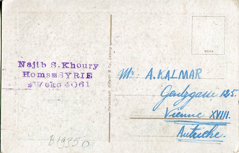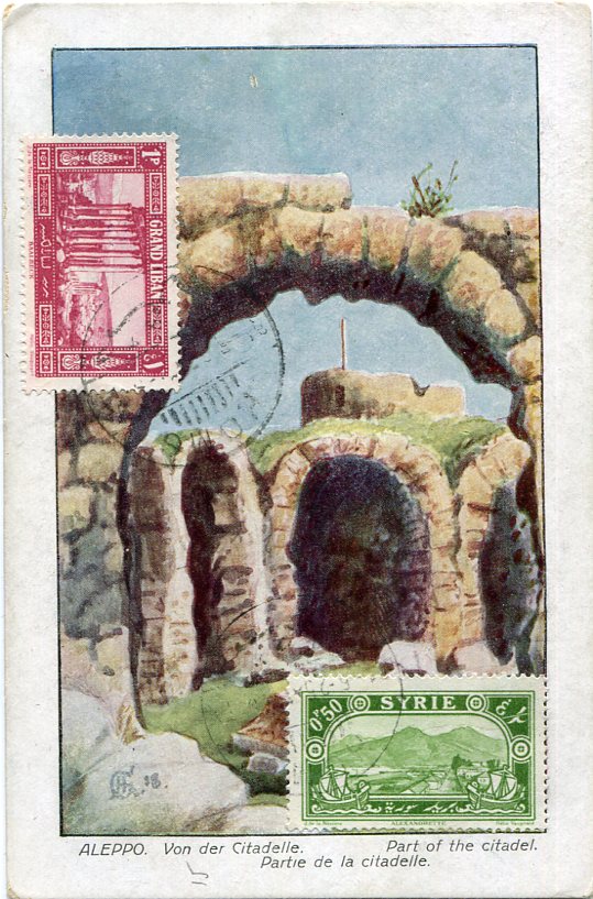 Syria: 1925 watercolour postcard of Aleppo Castle to Austria franked with 0p50 and 1p tied by Homs datestamps.