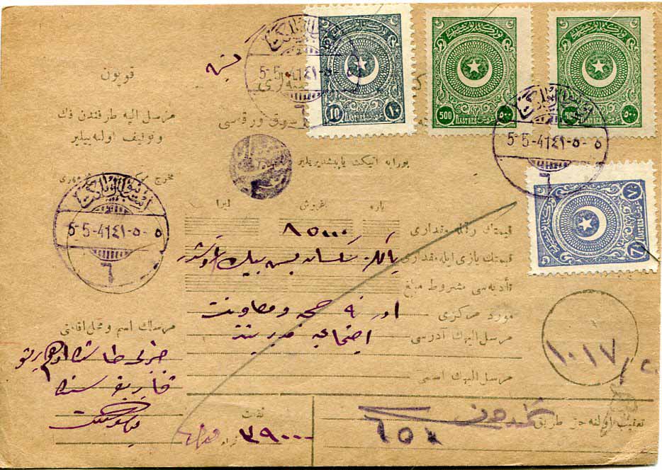 Turkey: 1925 (5 May). Money order to Edirne franked with 7 1/2pi, 10pi and two 500pi of 1923 star & crescent issue slitted and cancelled by Istanbul Paket 6 datestamps. Reverse 7 May Andrinople 4 arrival cds.