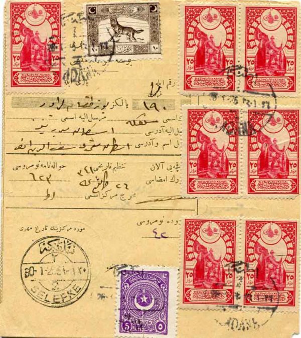Turkey: 1925 (26 January). Money order to Silifke franked with seven 25pi of 1917 Ottoman, 10pa and 5pi Republic stamps tied by ADANA 4 (A&P type 23) dispatch, 30 January and reverse 31 January SELEFKE 2 (A&P type 6, RR) arrival cds’s.