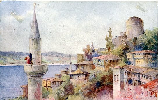 Turkey: 1925 (3 December). Watercolour Istanbul postcard to United States franked with pair 3pi of first printing star & crescent definitive for six piastres foreign postcard rate tied by Galata datestamps and 26 December Cranville, Ohio arrival cds. Oval bi-lingual American College / For Girls / Constantinople handcachet.