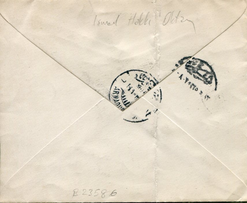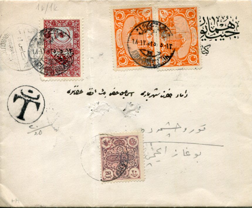Ottoman Turkey: 1925 (13 May). Philatelic Ismail Hakki Okday (son in law of the last Ottoman Sultan) cover franked with pair of 5pa Dolmabahçe Palace and Anatolian Government issue 1pi surcharged on 1pi Hejaz Railway revenue stamps tied by Karaköy – Galata 3 datestamps, 20(pa) by manuscript under “T” postage due handstamp alongside franked with 20pa postage due stamp. On top left Bosporus Kuruçesme private handstamp. Reverse same day Sehir (City) transit and next day Arnavutköy arrival cds’s. Vertical crease does not affect the stamps. Rare!