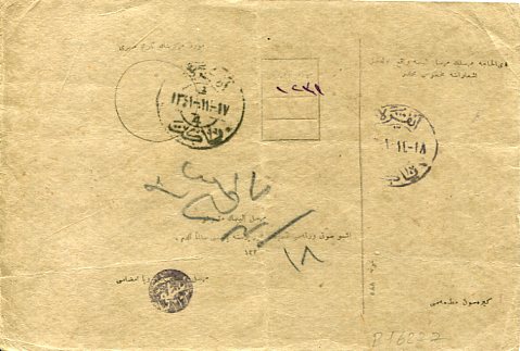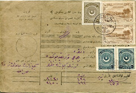 Turkey: 1925 (15 November). Parcel Card franked with pair of 50pi of 1920 Ottoman pictorial, pair of 10pi and 25pi star & crescent definitive stamps tied by BEYPAZARI (vilayet Ankara, A&P type 6) datestamps and on reverse 17 November ANKARA PAKET 4 (unrecorded by A&P) arrival cds’s.