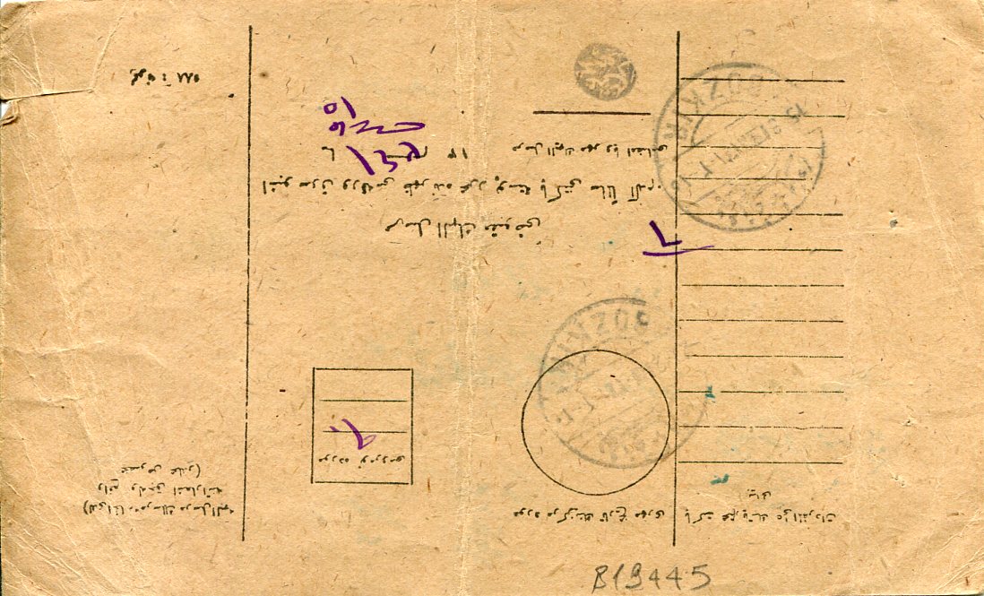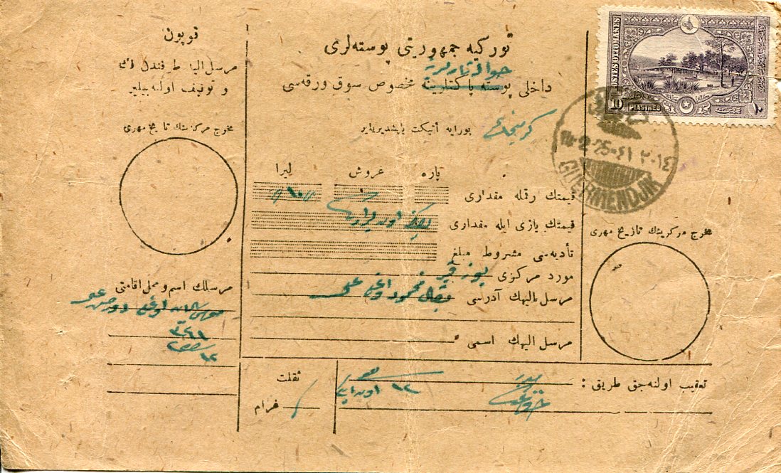 Turkey: 1925 (14 February). Parcel card to Bozkir franked with 10pi of 1922 Ottoman pictorial stamp slitted as per regulation and tied by previously unrecorded on document by A&P GERMENCIK – GUERMENDJIK (vilayet Aydin, A&P type 4) datestamp. Reverse next day Bozkir (vilayet Konya, A&P type 1) arrival cds’s. Folded on middle.