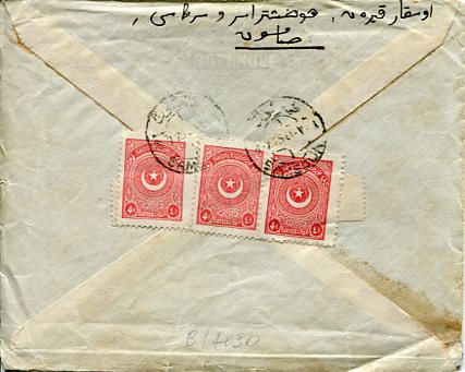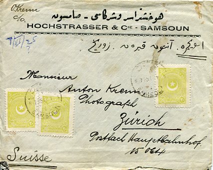 Turkey: 1925 (8 July). Commercial bi-lingual pre-printed cover with its ten pages contents in German to Zurich, Switzerland franked with three 20pa and on reverse three 4 ½k. star & crescent definitive stamps tied by SAMSUN – SAMSOUN 1 (A&P type 25, R) datestamps.