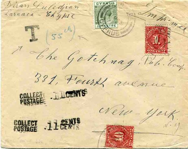 Cyprus: 1926 (7 April). Underpaid cover to United States franked with 1/2pi and tied by Larnaca datestamp alongside ‘T’ postage due cachet and 55cts in brackets by manuscript applied and due collected in Cyprus. On arrival at New York franked with 1c and 10c postage due stamps and ‘COLLECT POSTAGE 11 CENTS’ handstamps.