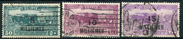 Egypt: 1926 (24 August). Surcharged on Agricultural and Industrial exhibition values used set of 3. Sg. 135/137