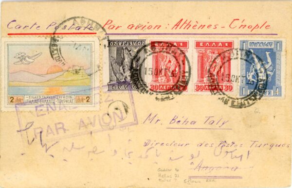 Greece: 1926 (15 October). Athens Constantinople by Airmail postal card to Ankara franked with 2d. Aerospresso Patakonia, 20l. and two 30l. and 1d. definitive stamps tied by Athens datestamps. Reverse Istanbul transit and 18 October arrival cds’s. It is the rarest of Greek flight covers which only 5 flown. Muller 7, Hellas 21, Goddar 16