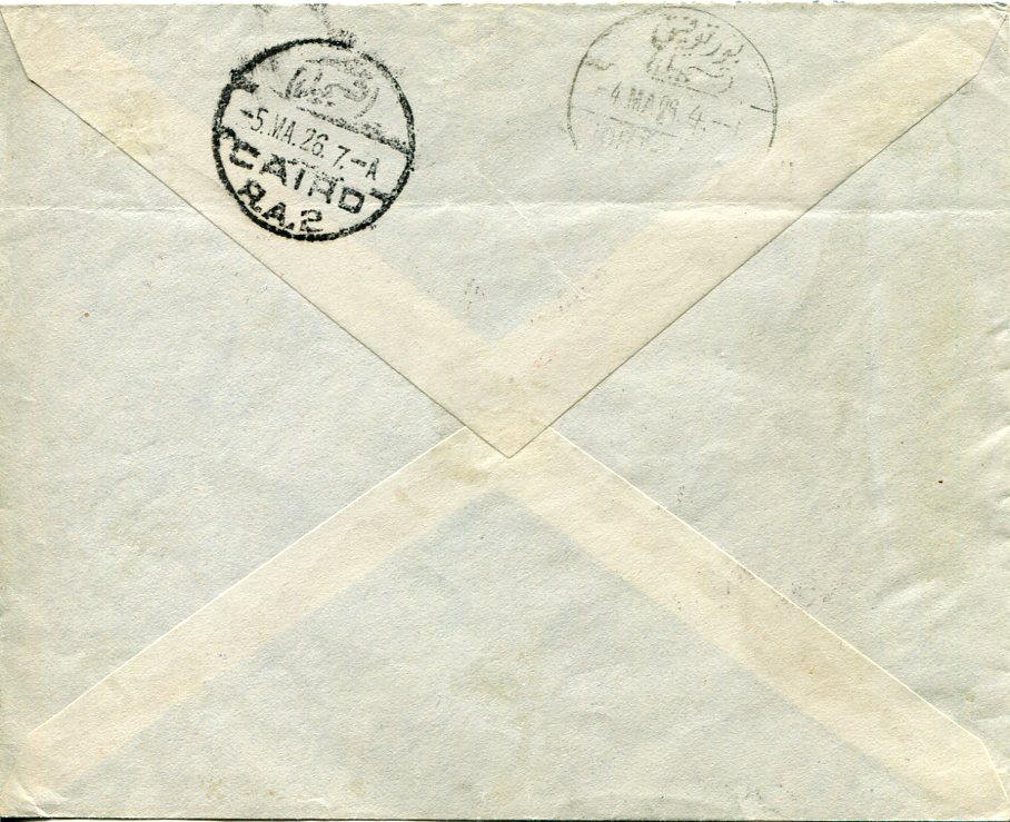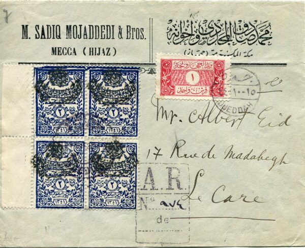Saudi Arabia / Hejaz and Nejd: 1926 (28 April). M. Sadiq Mojaddedi – Mecca (Hijaz) imprinted registered A.R. philatelic cover to Egypt franked with “Nejd Sultanate Post” overprinted on Hejaz Notarial Fiscal stamp marginal block of four and 1pi of 1926 Hejaz and Nejd issue tied by two different types DJEDDAH datestamps and A.R. handcachet. Reverse 4 May Port-Said transit and next day Cairo arrival cds’s. Sg. 217, 263