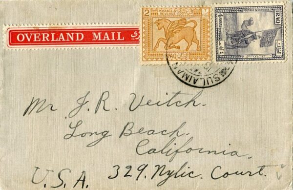 Iraq: circa 1926 cover to United States franked with 2a and 4a of 1923-25 pictorial stamps tied by SULAIMANIAH datestamps and type L-4 perforated OVERLAND MAIL label. Cover flap missing.