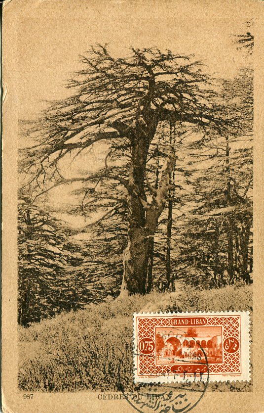 Lebanon: 1926 Cedars of Lebanon sepia postcard franked with 0p75 and tied by Beyrouth Place Des Canons datestamp. Philatelic. ed. Sarrafian Bros. 987