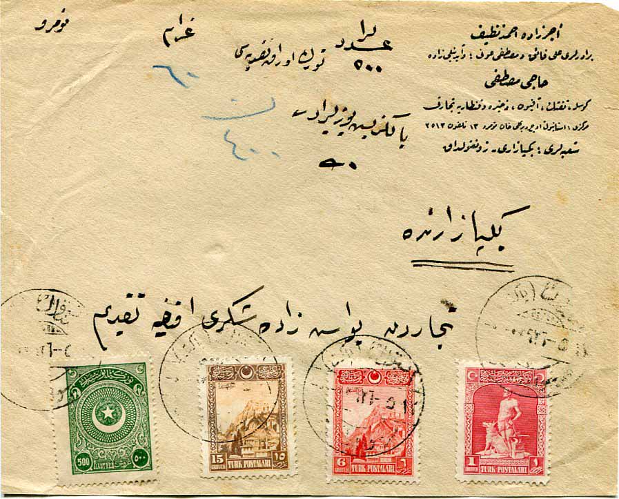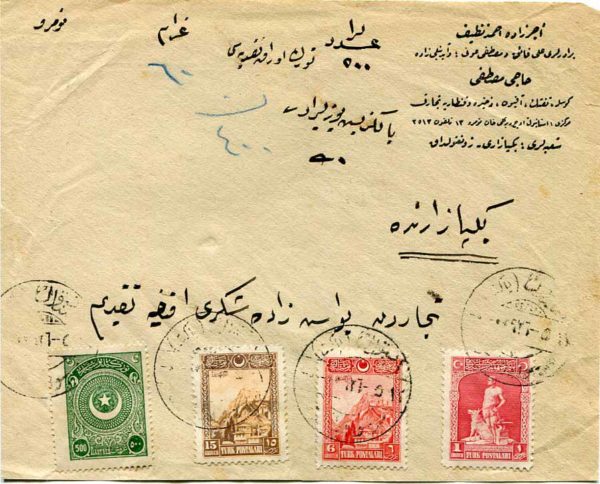 Turkey: 1926 (12 May). Cover front used as money order to Beypazari, Ankara franked with 1k, 6k, 15k and 500pi of 1923 star & crescent issue tied by Istanbul (Paket) – Mersule Dairesi datestamps. Stamps are NOT slitted.