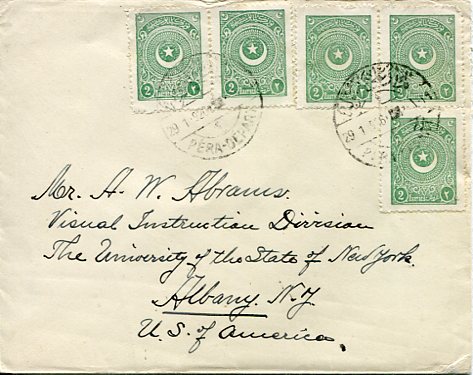 Turkey: 1926 (29 January). Cover to United States franked with single and two pairs of 2pi of third printing star & crescent stamps for ten piastres single weight foreign letter rate tied by Pera-Depart datestamps. Reverse no postal markings. Scarce solo usage of 2pi.