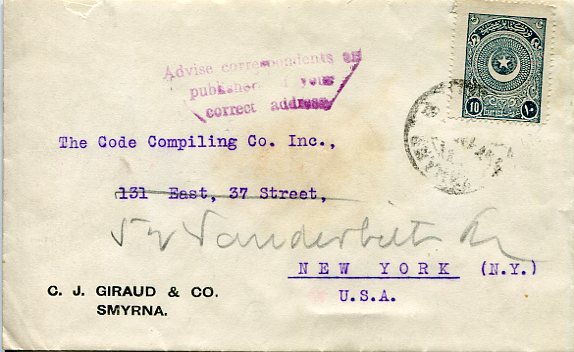 Turkey: 1926 commercial cover to United States franked with 10pi of first printing star & crescent definitive for single weight foreign letter rate tied by Izmir – Smyrne datestamp. Reverse no postal markings.