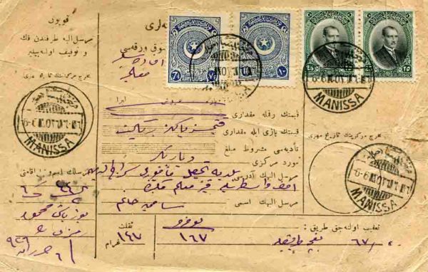 Turkey: 1926 (6 June) Money order franked with 7 1/2k and 10k star & crescent and two 25k of 1926 stamps tied by MANISSA (A&P type 21) date stamps. Reverse KARA-HISSAR 3 (A&P type 23, unrecorded on document) transit and DIARBEKIR 3 (A&P type 23, RR) arrival cds’s.