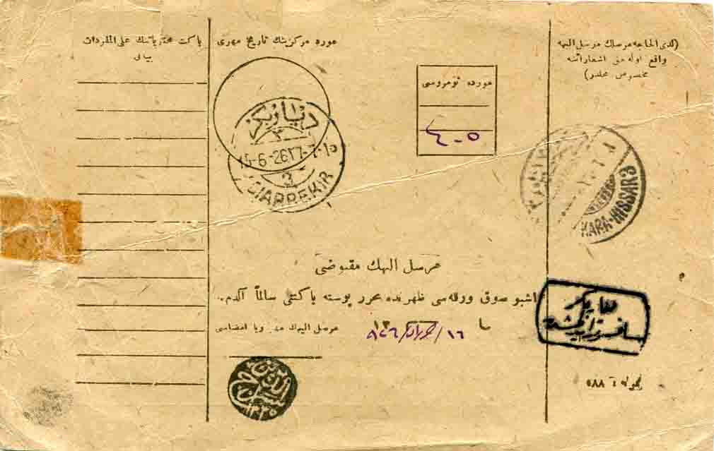 1926 Turkey Money Order to Diyarbakir