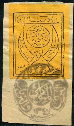 Yemen Kingdom: 1926. Inland Postage 1/16 or 2 1/2b orange imperforate on piece with commemorative cancellation. Mi. 2, Sg. 2