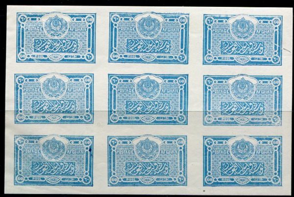 Afghanistan: 1927 (29 October). New currency stamps 60p light blue unmounted mint part sheet of 9 with plate flaw on third stamps variety. Sg. 190A var