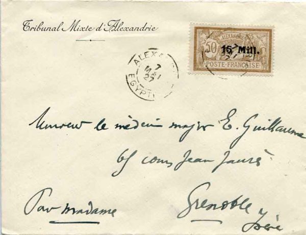 Egypt: 1927 (7 May). ‘Tribunal Mixte d’Alexandrie’ court cover to Grenoble, France franked with French Post Office in Alexandria 15m surcharged on 50c tied by Alexandrie Egypte datestamps. Reverse sender cachet. Scarce late usage. Sg. 47