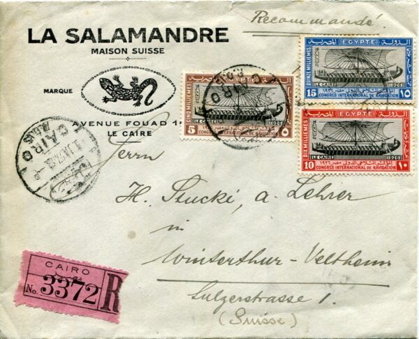 Egypt: 1927 Salamander advertising registered cover to Winterthur, Switzerland franked with complete set of International Navigation Congress stamps.