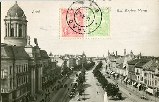 Romania: 1927 photocard titled ‘Bul. Regina Maria’ franked with 2l and 3l tied by Arad datestamp. Reverse blank.