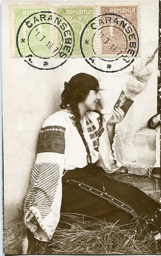 Romania: Postcard of native woman franked with with various stamps and tied by Caransebes commemorative datestamps. Reverse blank.
