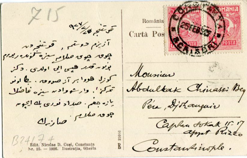 Romania: 1927 (25 February). Postcard titled ‘Constanta Giamia’ to Turkey franked with pair of 3l King Ferdinand portrait stamps tied by CONSTANTA SCRISORI datestamp and on front 2 March Pera and Galata arrival cds’s. ed. Nicolae D. Cusi #25