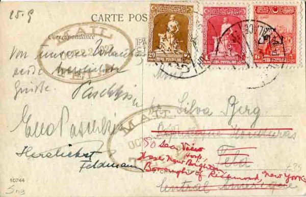 Turkey: 1927 (25 September). Postcard of Bebek, Istanbul to United States franked with 20pa and 1k of 1926 definitives and 6k 1st Smyrna Exhibition opt. commemorative stamp tied by Hotel Pera Palace cancels alongside MAIL TELLA OCT.22 1927 oval arrival cancel.