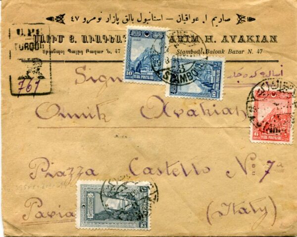 Türkiye: 1927 (23 August). Armenian merchant Sarim H. Avakian multi lingual imprinted registered cover to Italy franked with 2 1/2k, 6k and two 10k pictorial stamps tied by Istanbul datestamps. Reverse 1 September Venezia Milano ambulant and same day Pavia arrival cds’s. A stamps, probably charity, removed on reverse.
