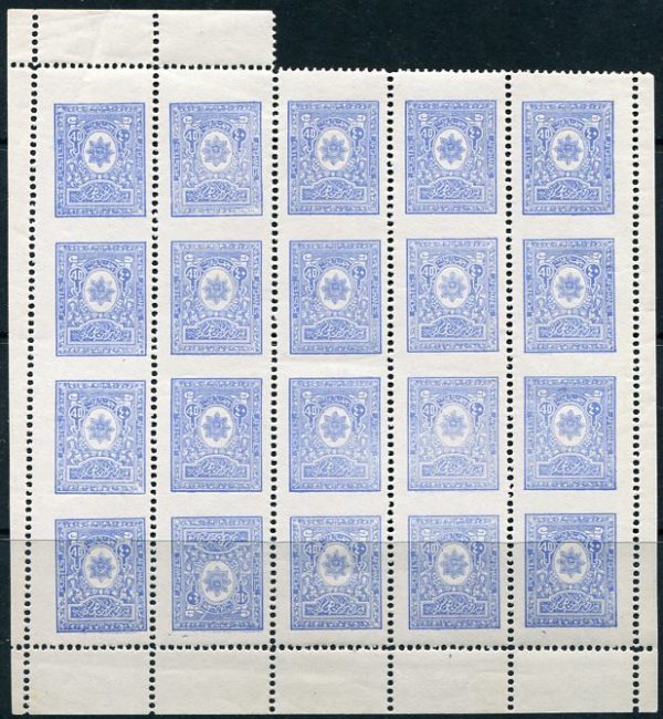Afghanistan: 1928. Coat of Arms 40p ultramarine unmounted mint sheetlet of 20 with first two stamps of bottom row being tete-beche vertically imperf between. One stamp hinge remainders and one has a small gum soil otherwise very scarce multiple. Sg. 195e, 195f