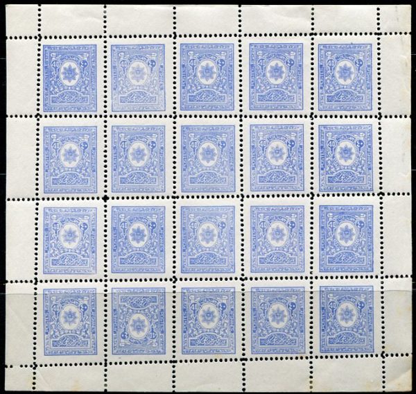 Afghanistan: 1928. Coat of Arms 40p ultramarine unmounted mint sheetlet of 20 with first two stamps of bottom row being tete-beche. Hinged on margins and couple of rust spots on 18th and 19th stamps. Sg. 195, 195a