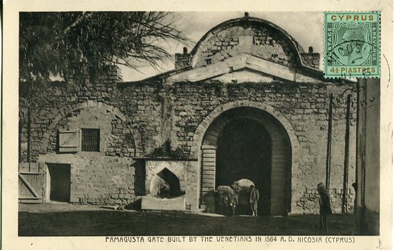 Cyprus: 1928 (6 July). Postcard titled ‘Famagusta Gate Built by the Venetian in 1564 A.D. Nicosia’ (ed. Mangoian Bros) franked with 4 1/2pi KGVs tied by Nicosia datestamp. Sg. 111