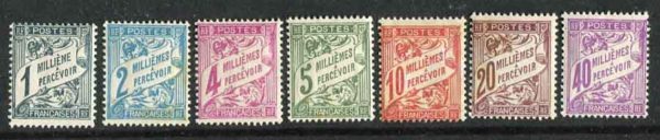 Egypt: 1928 (February). Postage due stamps of France surcharged for French Post Office in Alexandria mint o.g. set of seven. 2m and 10m heavily stained. Sg. D90/95, 97