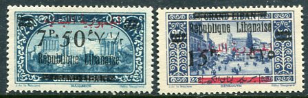 Lebanon: 1928 Arabic red overprinted on surcharged pictorial stamps mint o.g. set. Sg. 122/123