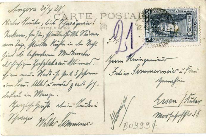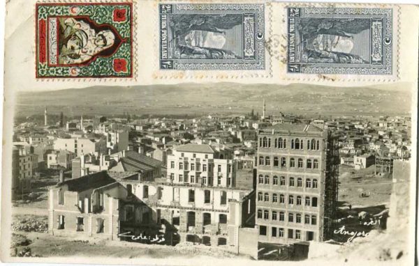 Turkey: 1928 photocard of Ankara – Angora to Essen, Germany franked with three 2 1/2k and 2 1/2k Red Crescent Society charity stamps tied by illegible dispatch datestamps.