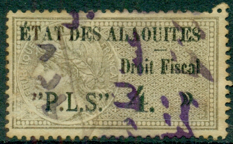 Syria – Alaouites: 1929 ETAT DES ALAOUITES Droit Fiscal “P.L.S.” 4. overprinted on French fiscal stamp used in French Occupation of Syria. Very rare. Duston 14