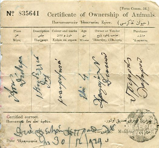 Cyprus: 1929 certificate of ownership of Animals struck by V.R. Mukhtar seal of Nicosia.