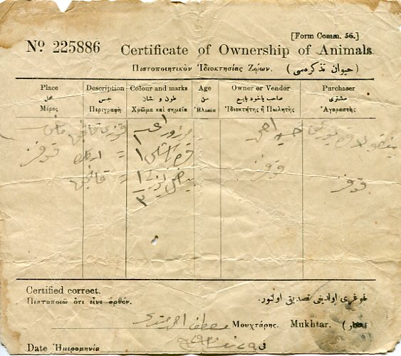 Cyprus: 1929 certificate of ownership of Animals struck by V.R. Lapathos Mukhtar seal of Famagusta in Ottoman Turkish.