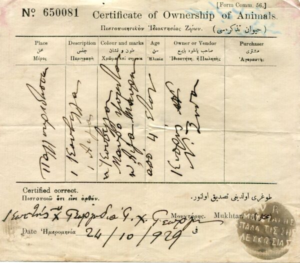 Cyprus: 1929 Certificate of Ownership of Animals struck by V.R. PALOURIOTISSA of Nicosia Mukhtar seal.