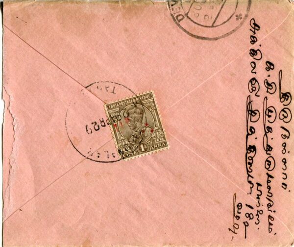 1929 cover used locally franked with 1a. and tied by Thirunallar datestamp.