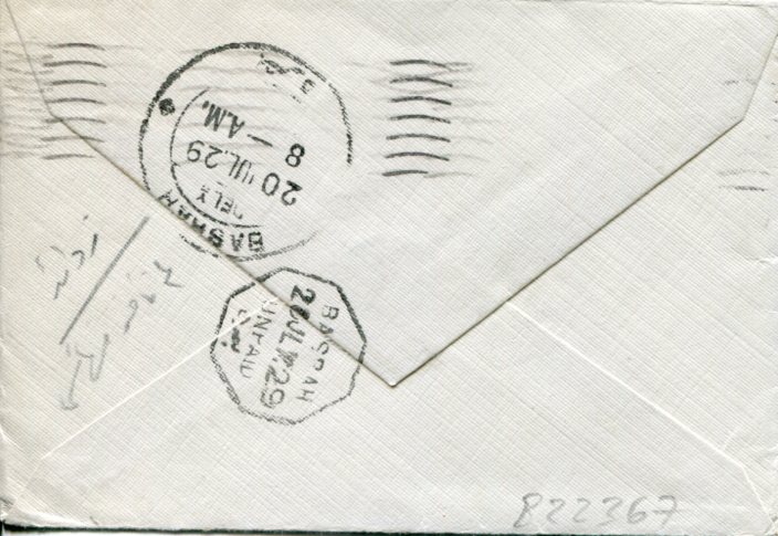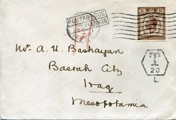 Iraq: 1929 (27 June). Cover to Iraq franked with 1 1/2d UPU Congress KGV stamp tied by London machine cancel alongside POSTAGE DUE /    ANNAS and octagonal “T 20” L handcachets. Reverse  20 July Basrah arrival and same day UNPAID cds’s.
