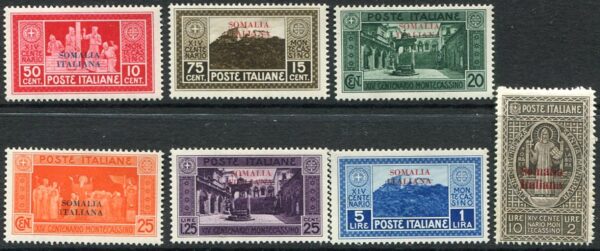 Somalia – Italian Occupation: 1929 (14 October). Montecassino Abbey stamps of Italy overprinted “Somalia Italiana” mint o.g. set. Sg. 119/125. *