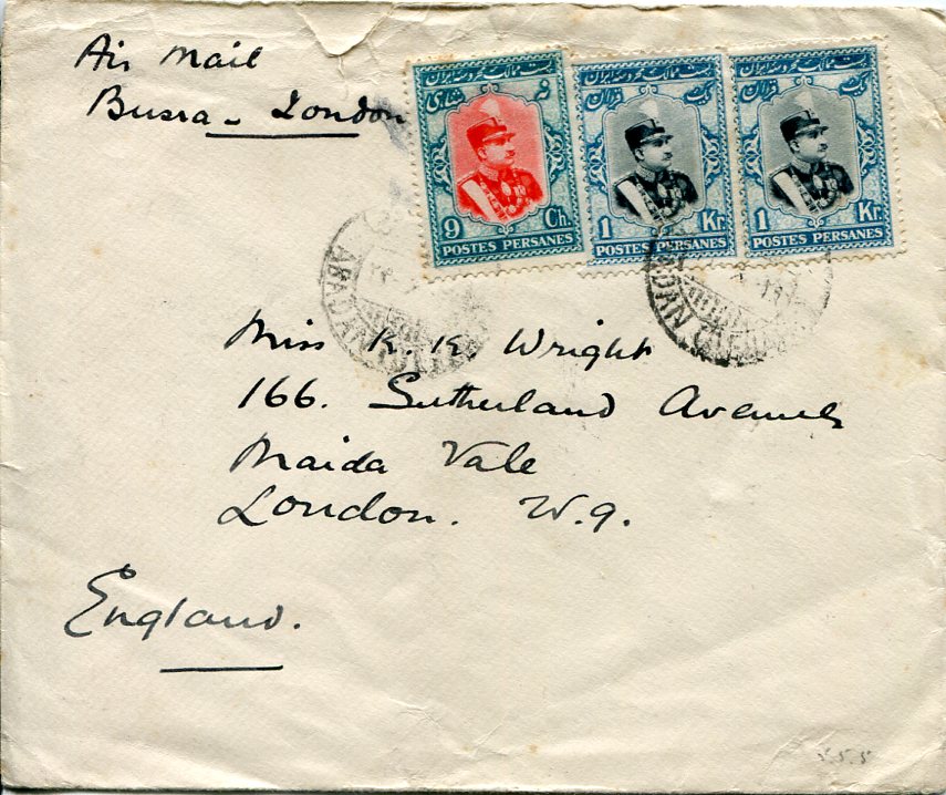 Iran: 1929 (June). Cover to London endorsed on top Air Mail / Busra – London franked with 9ch and the 1kr Shah Coronation stamps tied by Abadan datestamps. Reverse 24 June Basrah transit cds.