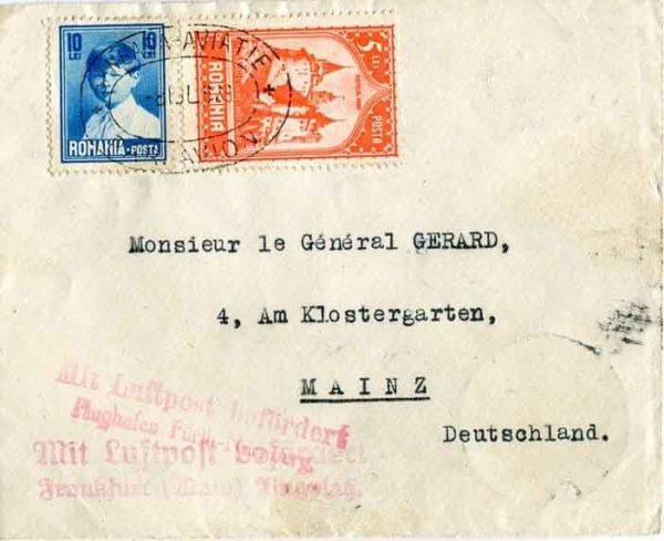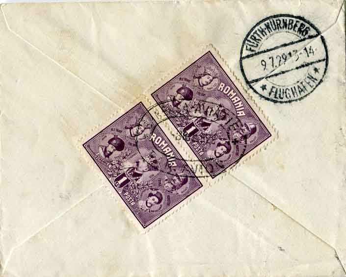 Romania: 1929 (8 July). Airmail cover to Germany franked with pair of 1l on reverse and 5l anniversary of union of Romania and Transylvania commemorative and 10l King Michael definitive tied by BANLASA – AVIATIE * PAR AVION datestamps and next day Furth Nurnberg Flughafen arrival cds.
