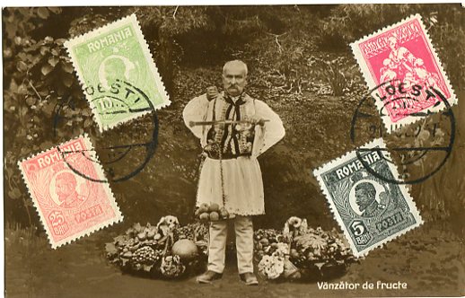 Romania: 1929 postcard of Fruit Seller franked with 5b, 10b, 25b and 50b tied by Ploesti datestamps. Reverse blank.