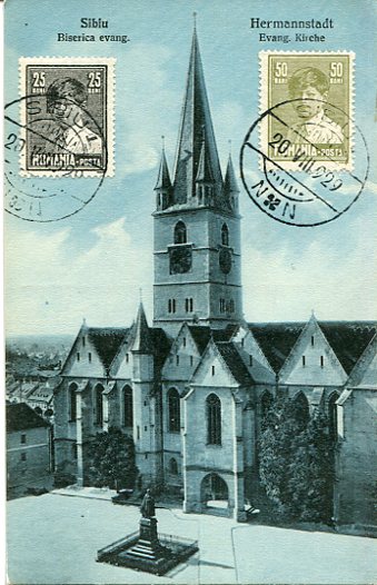 Romania: Postcard of Sibiu franked with with various stamps and tied by commemorative datestamps. Reverse merchant cachet otherwise blank.