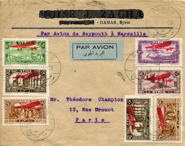 Syria: 1929 (16 June). Air Union – Lignes D’Orient cover to France franked with set of red aeroplane overprinted issue of 1926 with additional 2p and 3p, 0p50 and 2p surcharged on 1p25 of 1929 issue airmail stamps tied by Damas datestamps. Reverse same day Beirut transit and 20 June Paris arrival cds’s. Cover taken from Damascus to Beirut by motor car then flown Beirut to Athens by Hydravion CAMS 53 then to Corfu by SPCA ‘Meteore” F-AIFO and from Corfu to Marseille by CAMS 53 F-AIQY. Sg. 192/195, 223, 225