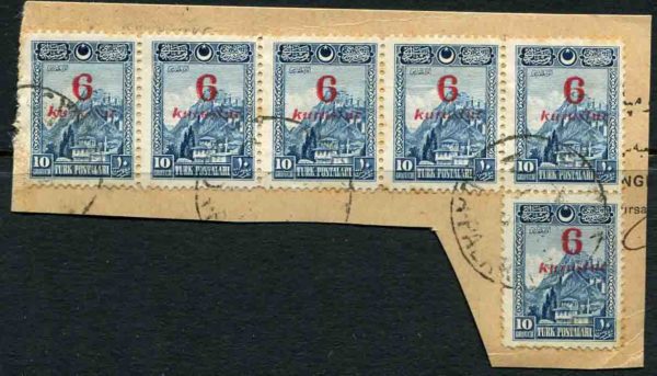 Turkey: 1929 (March). Surcharged with Latin Characters postage stamps 6k on 10k deep blue L shape strip of six with broken 6 and partly erased “kurustur” error on first stamp on piece tied by ADAPAZARI date stamps.