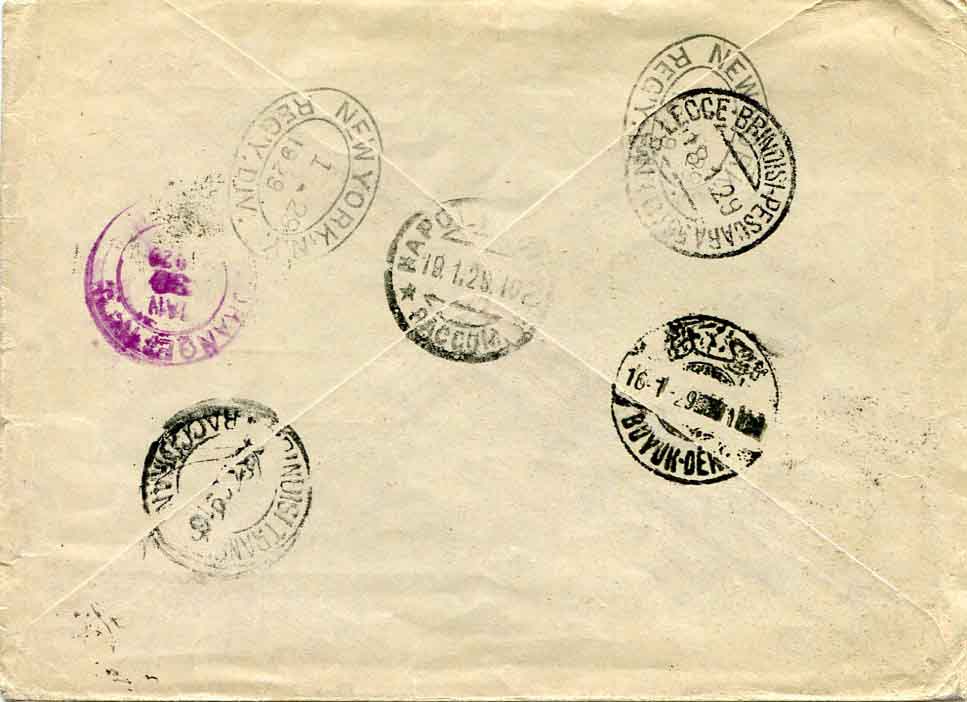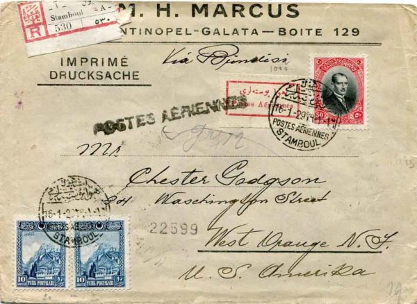 Turkey: 1929 (16 January). Registered airmail commercial cover to United States marked by manuscript via Brindisi franked with two 10k and 50k of 1926 pictorial stamps tied by POSTE AERIENNES STAMBOUL datestamps, bilingual Stamboul registration and Postes Aeriennes labels as well as straight line POSTES AERIENNES handcachet. Reverse 16 January Buyuk-Dere dispatch, 18 January Brindisi & 19 January Napoli transit and 29 January New York & 30 January West Orange arrival cds’s. Fascinating cover.