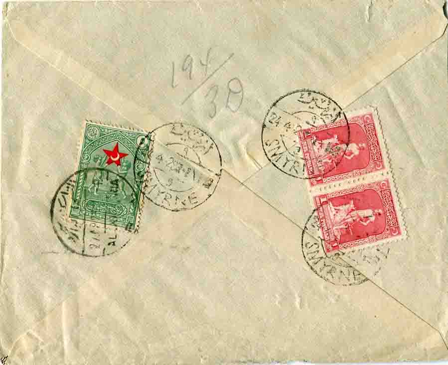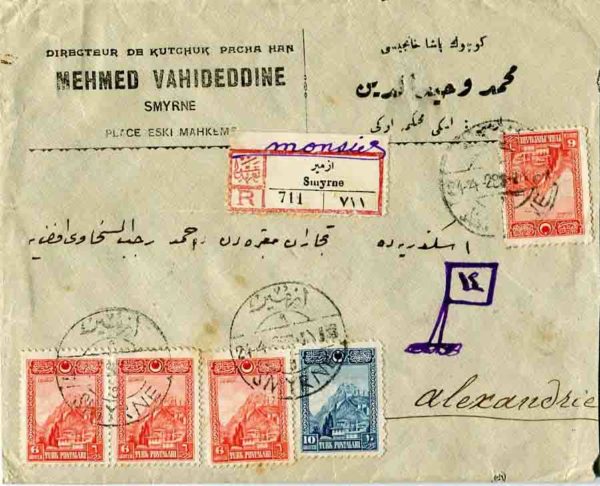 Turkey: 1929 (24 March). Registered commercial cover to Alexandria, Egypt franked with pair of 1g on reverse, three 6g and 10g of 1926 London printing stamps as well as 5k. Children Aid charity stamp (cancelled by 27.03 arrival cds), all tied by SMYRNE 9 (A&P type 113) date stamps. Isfila 1160, 1165, 1166, C4